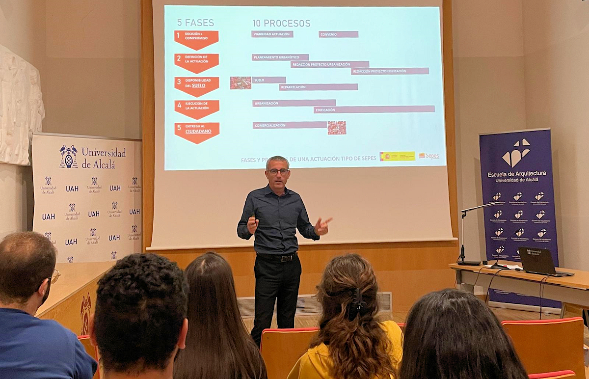 Posteriormente, Vázquez presentó a los alumnos de 4º y 5º de Arquitectura la actividad de SEPES y destacó la nueva hoja de ruta de la entidad como instrumento de las políticas del Gobierno de España en materia de vivienda asequible, con cuidados proyectos que incluyen la regeneración de suelos públicos en desuso, con el objetivo de crear una nueva ciudad donde la vivienda, los servicios y las actividades económicas confluyan de forma complementaria en un mismo territorio.