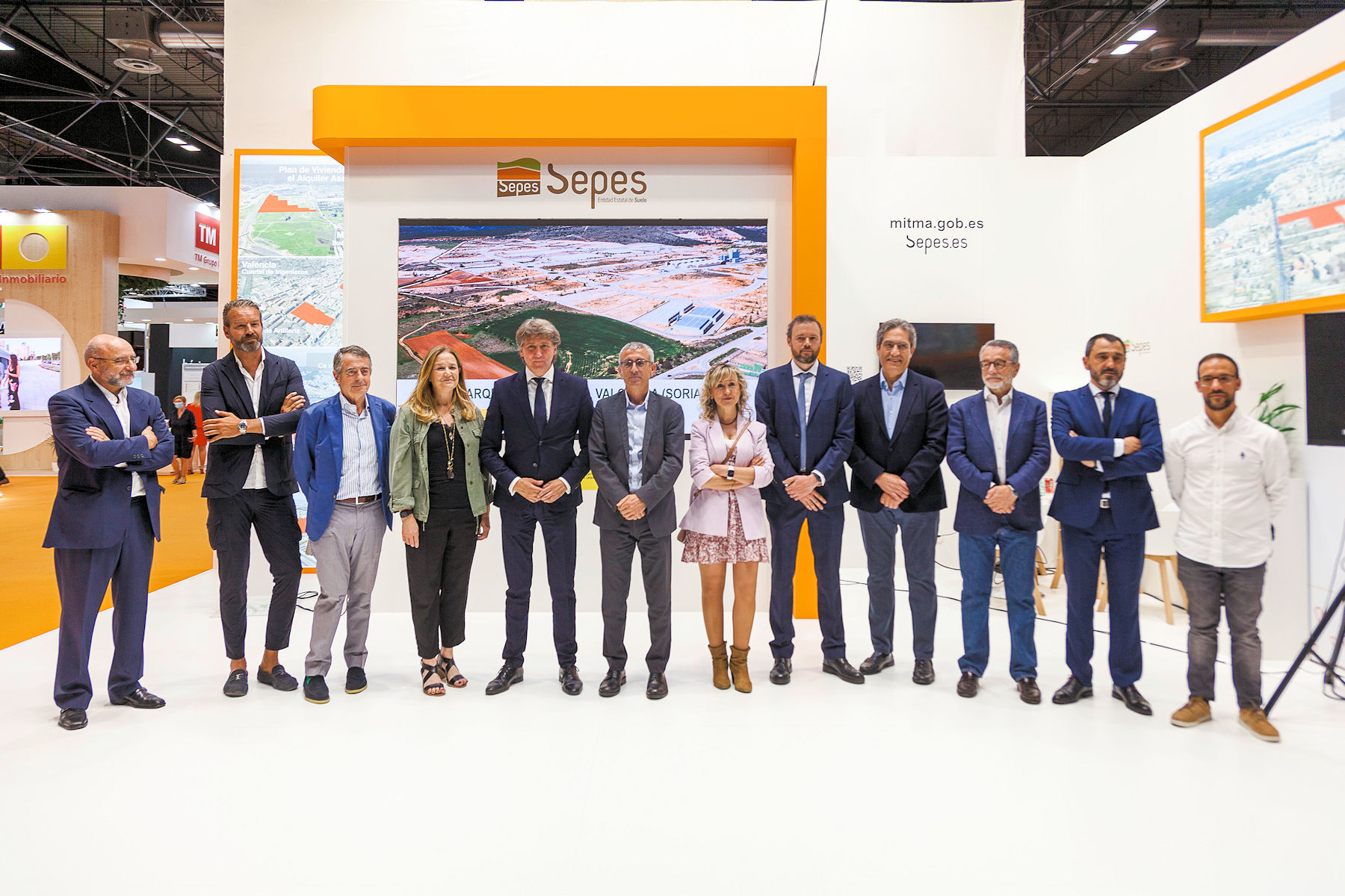 Fidel Vázquez, director general de Sepes, junto al alcalde de Soria, Carlos Martinez, han presentado en el salón inmobiliario de Madrid (SIMA) el parque empresarial Valcorba (Soria), donde el Ministerio de Transportes, Movilidad y Agenda Urbana (MITMA), a través de la Entidad Estatal de Suelo, ha invertido más de 17 millones de euros.