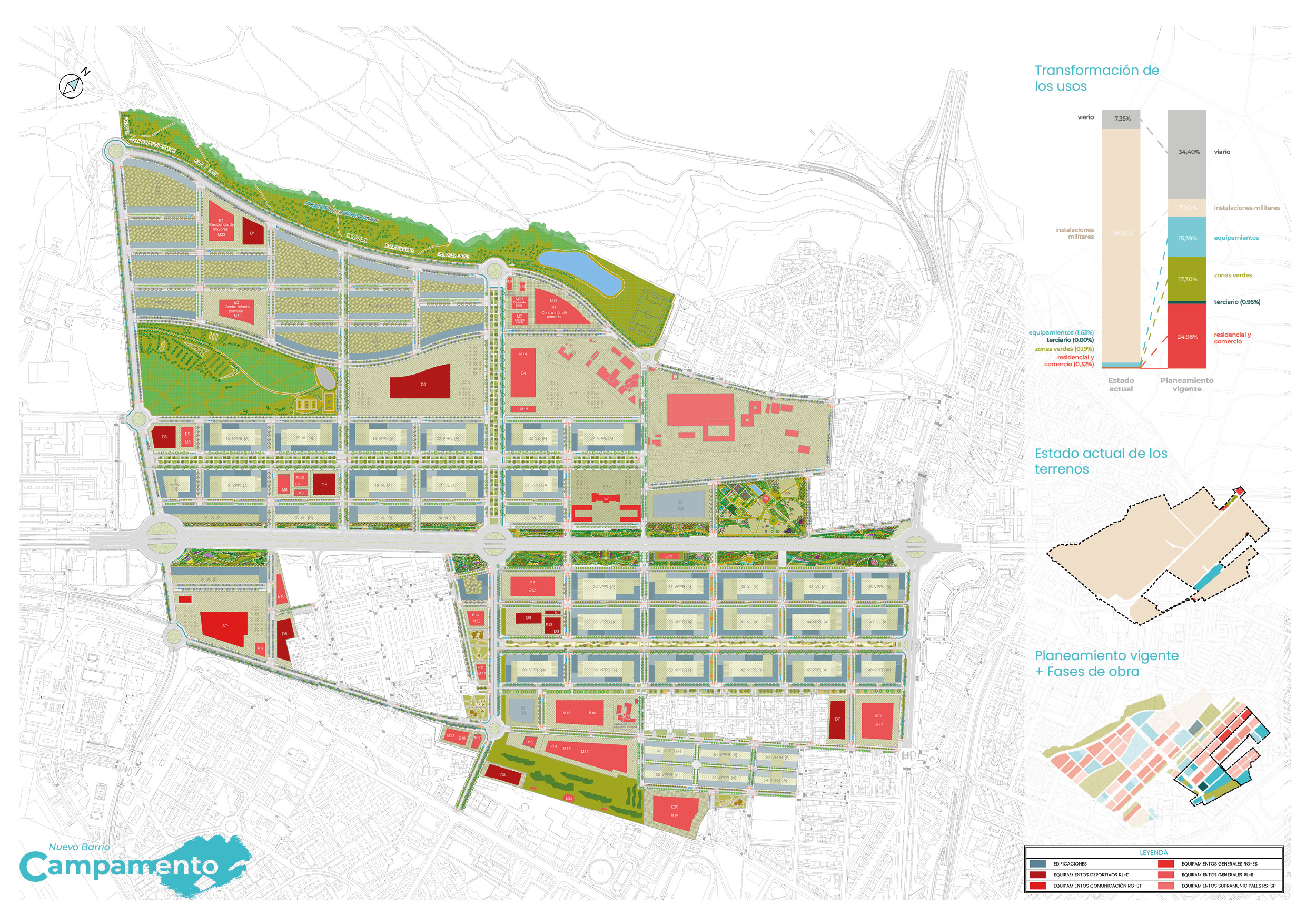 Campamento es un suelo de carácter urbano que ha perdido su uso y que se rescata bajo la premisa de la regeneración urbana como herramienta para abordar las necesidades y retos a los que se enfrenta la ciudad. Al otro lado de las tapias que delimitaban los diferentes acuartelamientos, grandes espacios opacos e inaccesibles para la gran mayoría de la población, el proyecto de Campamento busca “derribar” esos muros y recuperar este entorno para dotarlo de un nuevo uso y significado.